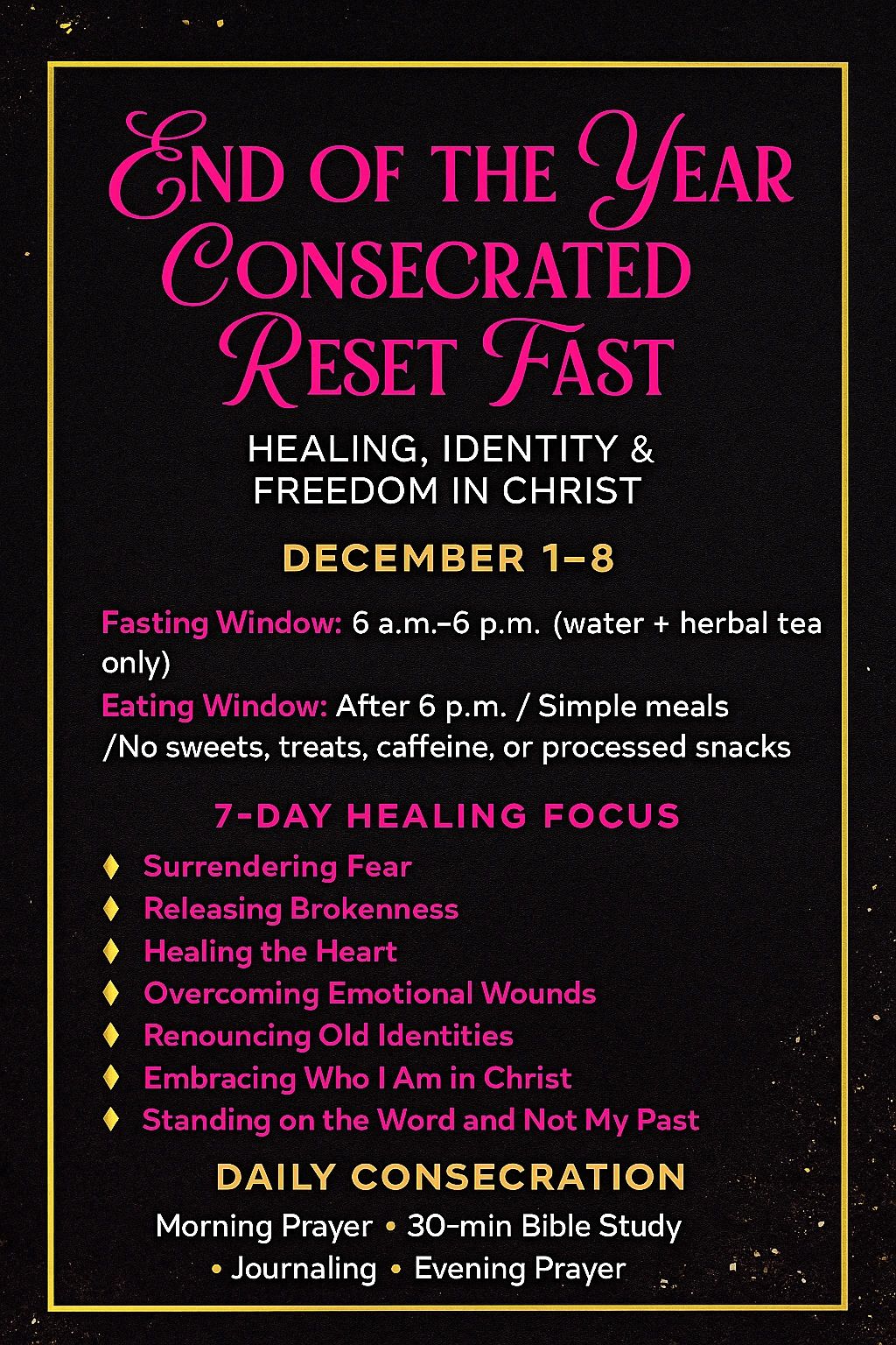 Step Into Your Reset. Step Into Your Healing. Step Into Your Year-End Consecration. This consecrated Reset Fast is an intentional 7-day spiritual alignment designed for women who are ready to lay down fear, release emotional residue, break trauma-based cycles, and step boldly into their God-given identity.